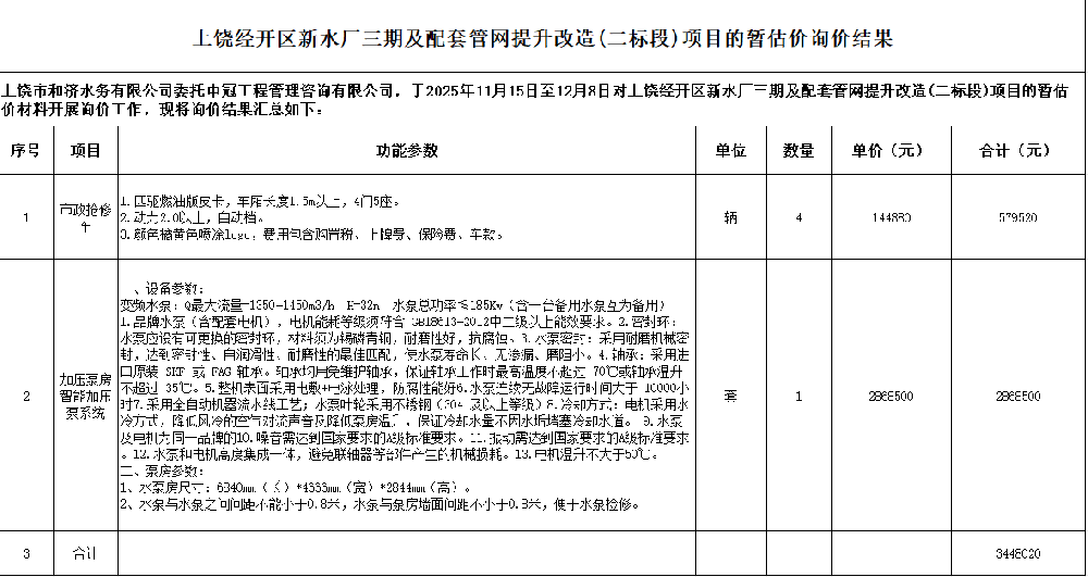 上饒國屬工程造價咨詢有限公司受上饒市和濟水務有限公司的委托,根據上饒市和濟水務有限公司的招標計劃,遵循公平、公正、公開、誠信原則,對上饒市和濟水務有限公司的自來水應急搶修材料供應單位(二期)進行公開詢價,誠邀相關供應商對采購單位所需進行報價。一、招標需求1.項目名稱:自來水應急搶修材料供應單位(二期)2.采... [更多]