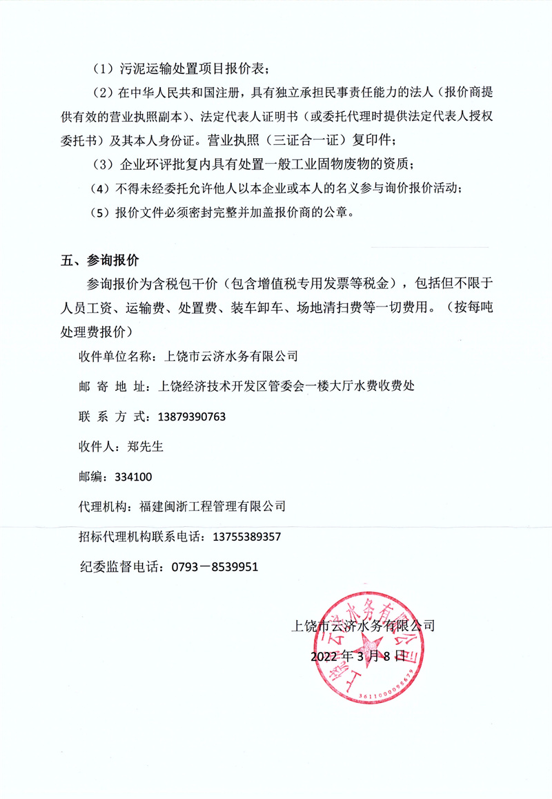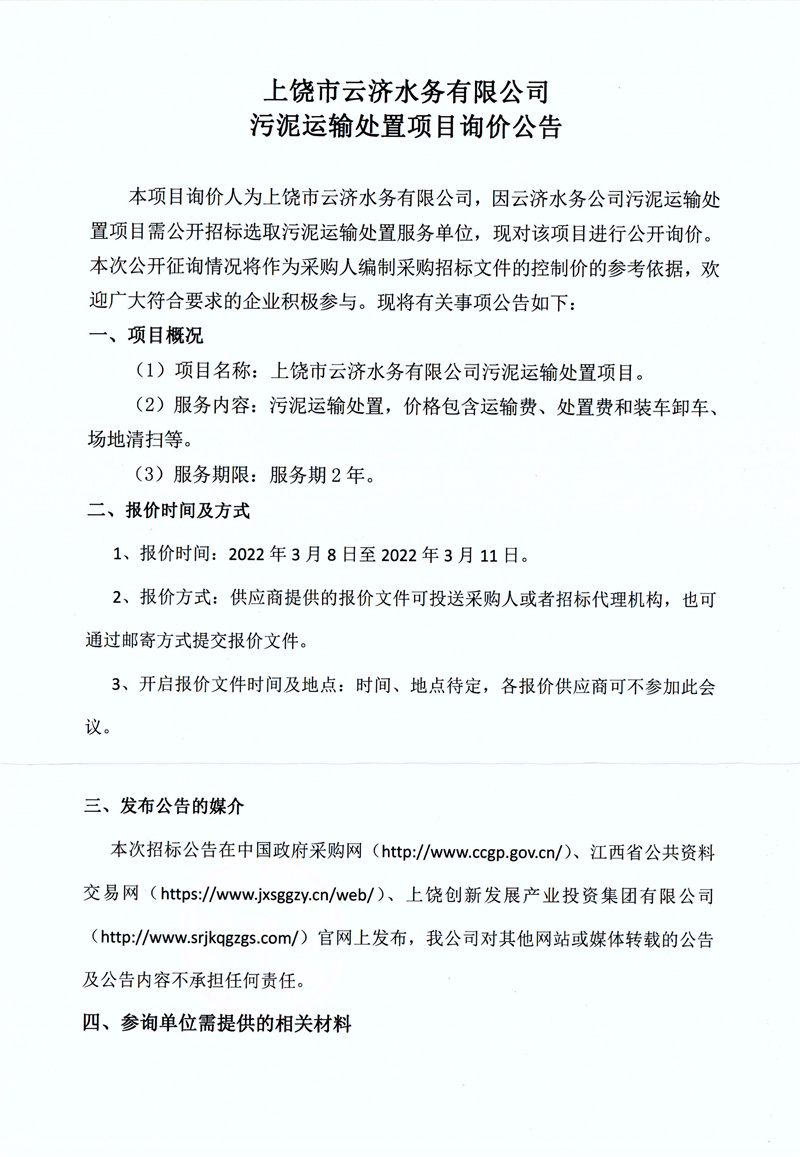 上饒市云濟(jì)水務(wù)有限公司污泥運(yùn)輸處置項(xiàng)目詢價(jià)公告