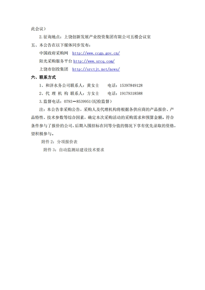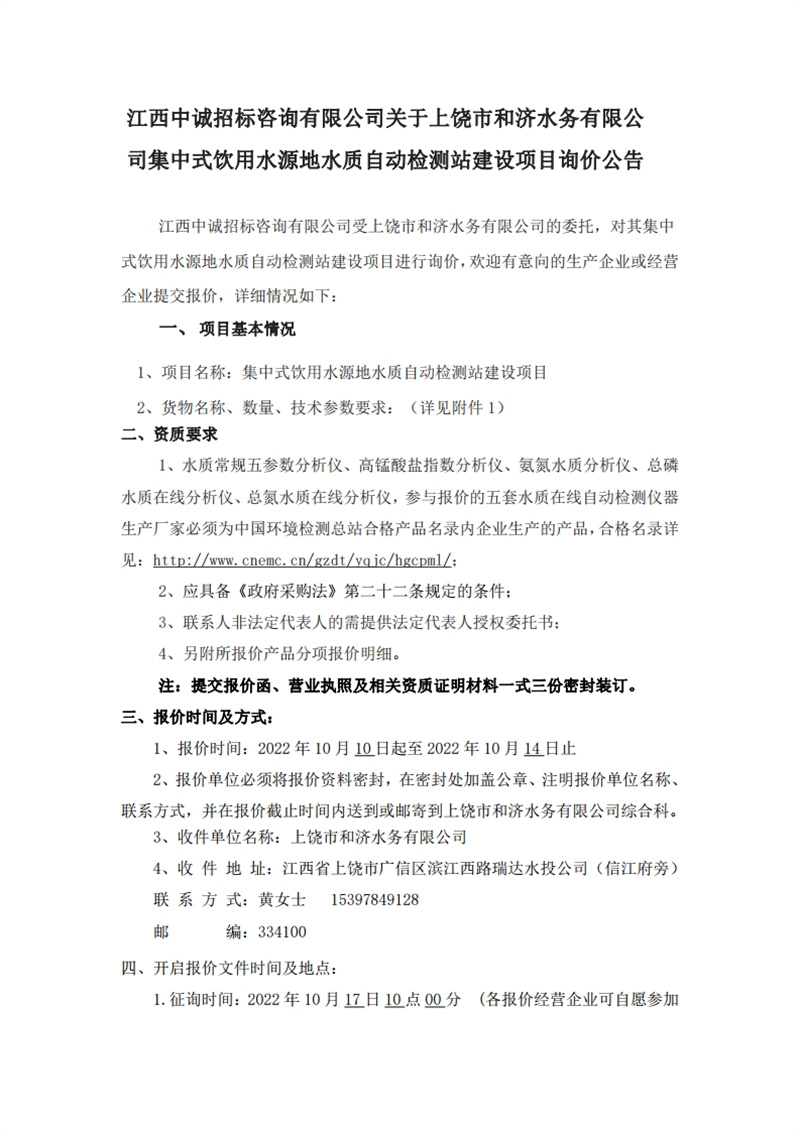 江西中誠(chéng)招標(biāo)咨詢(xún)有限公司關(guān)于上饒市和濟(jì)水務(wù)有限公司集中式飲用水源地水質(zhì)自動(dòng)檢測(cè)站建設(shè)項(xiàng)目詢(xún)價(jià)公告